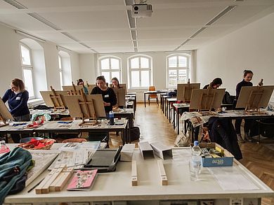 Eine weitere Lerneinheit: Wie enstehen Farben? Bei der Herstellung werden Staub und Bindemittel, in anderen Worten Pigmente für die Farben und zum Beispiel Öl oder Acrylat benötigt, um Ölfarben oder Acrylfarben herzustellen. Die im Seminar verwendeten Gouache-Farben sind im Grunde die Malkastenfarben, mit denen wir im Kinderalter bereits unsere ersten künstlerischen Erfahrungen erleben. Am Ende der kreativen Reise stand das persönliche Kartenbuch als „Endprodukt“, gefertigt aus einem selbstgemalten Bild, das in Streifen geschnitten und mit zwei selbstdekorierten Deckkarten aus Pappe zusammengeklebt wurde.