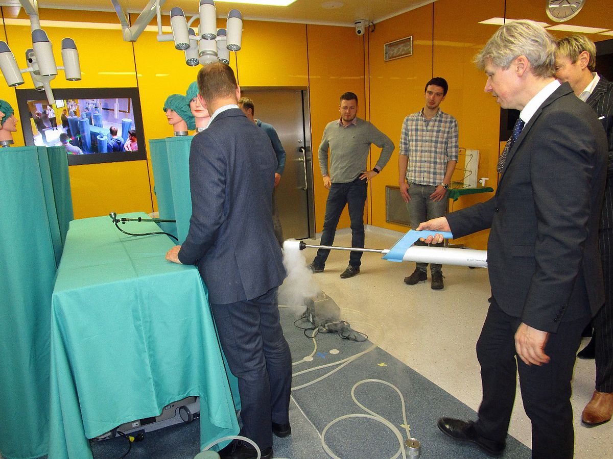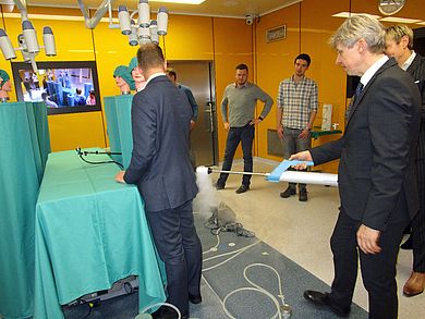 Im Anschluss an die Vorträge konnten die TeilnehmerInnen den Lehr- und Forschungsoperationssaal im Weidener Technologiecampus besichtigen und sich mit dem Opragon-System vertraut machen. Vor allem die Visualisierung des Luftstroms durch einen tragbaren Nebelgenerator und der Technikraum des Operationssaals hinterließen einen bleibenden Eindruck.