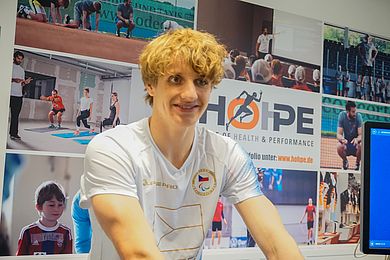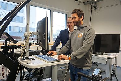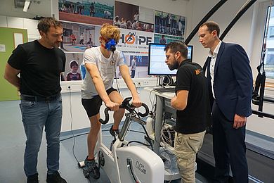 Auch Prof. Dr. Christian Schmidkonz, Leiter des ZLS, und Christian Wolf, Geschäftsführer des Kooperationspartners hohpe GmbH, freuen sich über den besonderen Besuch. Sie begleiten den Schwimmer bei der Leistungsdiagnostik. „Wir beginnen mit einer Körperanalyse. Dann geht es auf das Fahrrad“, erklärte Schmidkonz den Ablauf. „Dort analysieren wir die Sauerstoffaufnahme und wie fit du bist. Am Ende besprechen wir alle Werte und können dir sagen, an welchen Stellschrauben du noch drehen kannst.“