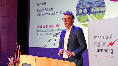 Auch Bayerns Wissenschaftsminister Markus Blume unterstrich in seiner Ansprache die Rolle von Innovation als Motor der Erneuerung: „Innovationspower von Weiden bis Weißenburg, von Hof bis Haßfurt: Die Metropolregion Nürnberg ist eine der innovationsstärksten Regionen Europas; in einer Reihe mit Oxford und Antwerpen. Es gibt hier doppelt so viele Patentanmeldungen wie im Bundesdurchschnitt. Und das ist kein Zufall: Die Kombination aus starken Hochschulen, hervorragenden Forschungseinrichtungen und mutigen Unternehmen wirkt in die Region hinein und strahlt zugleich weit darüber hinaus. Umbrüche und Transformationen werden hier als Chance begriffen. Dieser Spirit ist Vorbild für ganz Deutschland. Denn eines ist klar: Innovationskraft ist Wachstumsfaktor und Wohlstandsgarant.“