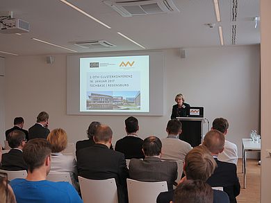 Insgesamt 100 Gäste zählte die OTH-Clusterkonferenz in der TechBase. Prof. Dr. Wolfgang Baier, Präsident der OTH Regensburg, Prof. Dr. Andrea Klug, Präsidentin der OTH Amberg-Weiden, und als „Hausherr“ Alexander Rupprecht, Geschäftsführer der R-Tech GmbH, begrüßten. Des Weiteren begrüßten Prof. Dr. Thomas Falter von der OTH Regensburg und Dr. Wolfgang Weber von der OTH Amberg-Weiden.