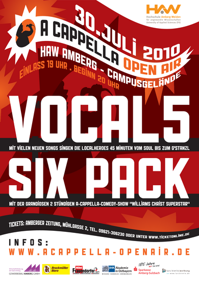 Am 30. Juli 2010 findet auf dem Campus der Hochschule in Amberg ein dreistündiger A Cappella Abend statt. Ab 20.00 Uhr tritt VOVAL5 mit vielen neuen Songs vom Soul bis zum G’stanzl auf. Um 21.00 Uhr folgen dann SIXPACK mit ihrer grandiosen, zweistündigen A Cappella Comedy Show „Williams Christ Superstar“. Einlass auf dem Campus ist ab 19.00 Uhr.