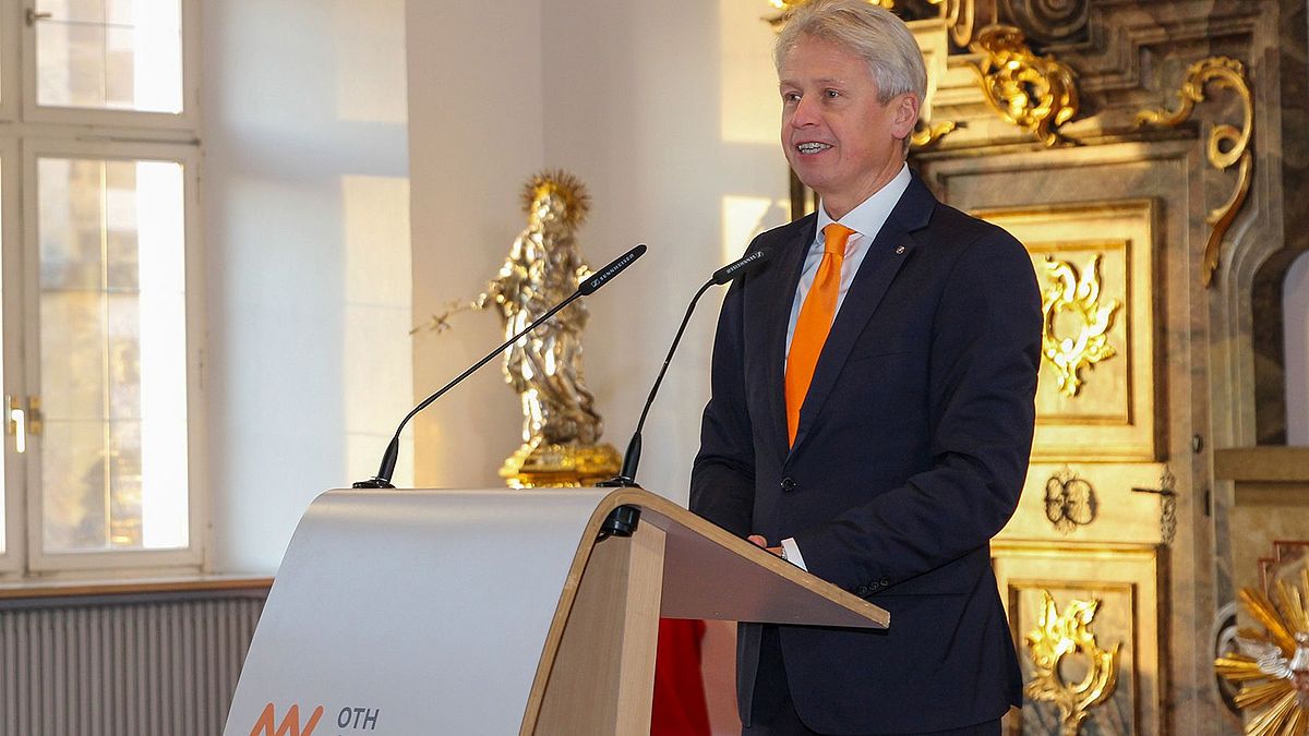 In einem Videogrußwort betonte Wissenschaftsminister Markus Blume die Bedeutung der Hochschule für die Region. Trotz des ausgefallenen Abiturjahrgangs verzeichne die OTH stabile Studierendenzahlen – darunter rund 2.000 internationale Studierende aus über 90 Nationen. Er würdigte das starke Engagement in Forschung und Transfer: Das Technologie-Transfer-Zentrum in Weiherhammer im Landkreis Neustadt an der Waldnaab bezeichnete er als „KI-Motor für Ostbayern“, die OTH selbst als „Top-Hochschule“ und „Zukunftsboost“ für die Region. Hochschulpräsident Prof. Dr. Clemens Bulitta griff die Worte des Ministers auf: „Es geht weiter nach oben. Wir haben im vergangenen Jahr gemeinsam viele Erfolge erzielt, auf die wir stolz sein können und auf denen wir weiter aufbauen.“