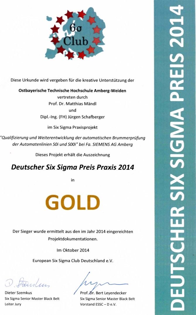 Das Labor für Akustik und Schallanalyse (LAuS) der Ostbayerischen Technischen Hochschule Amberg-Weiden, Fakultät Maschinenbau/Umwelttechnik in Amberg, vertreten durch Prof. Dr. Matthias Mändl und Dipl.-Ing. (FH) Jürgen Schafberger, hat für die wissenschaftliche Unterstützung eines Six Sigma Praxisprojektes der Siemens AG Amberg gemeinsam mit dem Unternehmens-Projektteam unter Leitung von Sebastian Graf den Six Sigma Preis Praxis 2014 in Gold gewonnen.