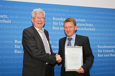 Das Bundesministerium für Umwelt, Naturschutz, Bau und Reaktorsicherheit (BMUB) hat am 29. September das Energieeffizienznetzwerk für Unternehmen in Bayern ausgezeichnet. Das Institut für Energietechnik (IfE) an der OTH Amberg-Weiden ist Träger dieses Netzwerkes – eines von bundesweit sechs Lernenden Energieeffizienz-Netzwerken (LEEN) und einziges Netzwerk dieser Art in Bayern. Dieses Engagement würdigte MinDir Franzjosef Schafhausen (BMUB) auf der LEEN-Jahreskonferenz in Berlin und übergab die Auszeichnung stellvertretend an Prof. Dr.-Ing. Markus Brautsch, Fakultät Maschinenbau/Umwelttechnik.