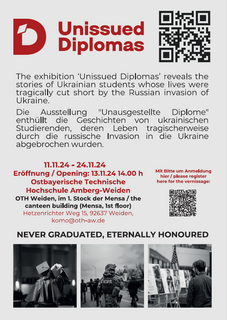 Die Ausstellung „Unissued Diplomas“ erzählt anhand von Fotografien und Kurzbiografien die Geschichte von 40 ukrainischen Studierenden, die im Krieg getötet wurden, bevor sie ihren Abschluss machen konnten. Sie möchte die Erinnerung an diese Menschen wachhalten, an den andauernden Krieg erinnern und an den Preis, den die Menschen in der Ukraine täglich in ihrem Kampf um Freiheit zahlen. Die von Studierenden konzipierte Fotoausstellung wurde seit 2023 bereits an über 100 Orten weltweit gezeigt - nun auch an der OTH Amberg-Weiden.