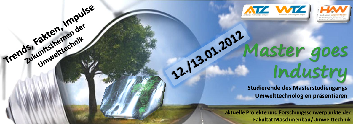 Am 12. und 13. Januar 2012 bietet die Fakultät Maschinenbau/Umwelttechnik der Hochschule Amberg-Weiden in Kooperation mit dem Amberger Technologie-Campus (ATC) eine Informationsveranstaltung für Unternehmen mit dem Titel „Master goes Industry“ an. Studierende des Masterstudiengangs „Umwelttechnologie“ präsentieren aktuelle Projekte und Forschungsschwerpunkte der Fakultät und des Studiengangs. Vorgestellt und diskutiert werden Zukunftsthemen der Umwelttechnik mit Trends, Fakten und Impulsen. Zielgruppe der kostenfreien Veranstaltung ist die mittelständische Wirtschaft der Umweltbranche und die interessierte Öffentlichkeit, die sich über die Kompetenzen zukünftiger Fach- und Führungskräfte informieren will, auch mit Blick auf den zunehmenden Fachkräftemangel. Im Rahmen der Vorträge besteht die Möglichkeit, die hochqualifizierten angehenden Absolventinnen und Absolventen des Masterstudiengangs „Umwelttechnologie“ kennen zu lernen, und zugleich Kontakte zu künftigen Mitarbeitern zu knüpfen: