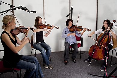 „Die Studioaufnahmen waren anstrengend. Aber für unsere Schülerinnen war diese Situation sehr motivierend“, so fasst Musikpädagogin Maria Anna Feldmeier-Zeidler vom Max-Reger-Gymnasium Amberg die Erfahrungen zusammen, welche die Mitglieder des Streichquartetts der Schule gemacht haben, als sie an der Hochschule in Amberg Aufnahmen für CD-Produktionen mit Werken unter anderem von Joseph Haydn und Scott Joplin anfertigen ließen. Die Studioaufnahmen entstanden im Rahmen eines Gemeinschaftsprojekts mit dem Studiengang Medienproduktion und Medientechnik (Fakultät Elektro- und Informationstechnik).