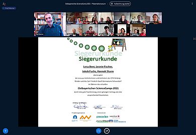 Auch beim virtuellen Format durfte die feierliche Abschlusspräsentation vor Ehrengästen nicht fehlen. In Vierergruppen stellten die TeilnehmerInnen dabei ihre Versuche, Ergebnisse und die zugehörige Theorie kurz vor. Die Jury, bestehend aus Vertretern der Hochschule und den Ehrengästen, wählte daraufhin die jeweiligen Gewinnerteams, die sich über Ehrenauszeichnung freuen durften.
