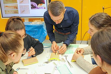 Im Lehr- und Forschungs-OP der Hochschule lernten sie wichtige OP-Tätigkeiten vom sterilen Anziehen über verschiedenste Wundnähverfahren bis zur Patientenvorbereitung hautnah kennen. Neben dem betreuenden Professor, Studiengangsleiter Dr. med. Stefan Sesselmann, wurden sie dabei von weiteren Experten begleitet.