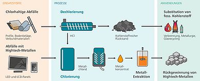 Im Projektverlauf wird bei Fraunhofer UMSICHT in Sulzbach-Rosenberg eine Demonstrationsanlage installiert und Versuchskampagnen durchgeführt. Dafür stellt die Firma Lober GmbH und Co. KG PVC-haltige Kunststoffabfälle zur Verfügung, die zur Behandlung von LCD-Panels bzw. LEDs verwendet werden. Dabei entstehen feste und flüssige Metallkonzentrate, die im Anschluss an der OTH Amberg-Weiden weiterverarbeitet werden. Hier werden die unterschiedlichen Hightech-Metalle aus den Metallkonzentraten aufgetrennt und dem Wirtschaftskreislauf zur Verfügung gestellt. Die Firma GRAMET GmbH und Co. KG untersucht die Hightech-Metalle abschließend auf ihre Reinheit und auf eine mögliche Marktplatzierung. Für weitere Produkte, die während des Verfahrens erzeugt werden, wird die Weiterverwendung ebenfalls eruiert.