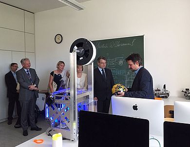 An den Austausch und die Diskussion im Senatssaal der Hochschule schloss sich eine Führung durch ausgewählte Labore der Fakultät EMI an, in der Professoren mit Mitarbeiterinnen, Mitarbeitern und Studierenden dem Besuch aus München die Anwendungswelt digitaler Medien, der angewandten Informatik und der Sicherheit von Datenübertragungen etwa auch in der Automobiltechnik präsentierten.