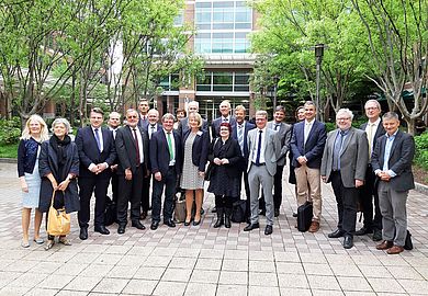 Gruppenbild vor der Georgia Tech: Mit dabei Prof. Dr. Andrea Klug, Präsidentin der OTH Amberg-Weiden (2. Person links neben Sibler), Prof. Dr. Wolfgang Baier, Präsident der OTH Regensburg, (links neben Sibler), Prof. Dr. Nikolaus Korber, Vizepräsident der Universität Regensburg (6. von links), mit Wissenschaftsminister Bernd Sibler (7. von links). Foto: Bayerisches Staatsministerium für Wissenschaft und Kunst