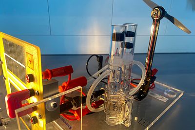 An unserem Modell zeigen wir Ihnen, wie aus Strom und Wasser mittels Elektrolyse Wasserstoff erzeugt wird und welche Anwendungsmöglichkeiten es gibt. Wir geben Ihnen einen Einblick in unsere aktuellen Forschungsthemen im Bereich der Kraft-Wärme-Kopplung und zeigen Ihnen unser auf Wasserstoffbetrieb umgerüstetes Blockheizkraftwerk (BHKW).