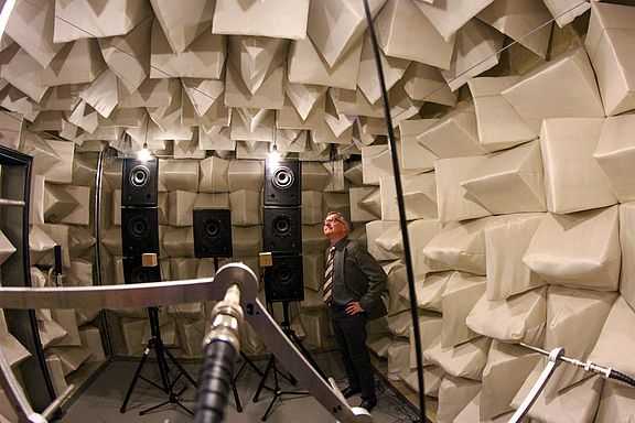 Lärm, Musik, Sprache und Geräusche, die menschliche Wahrnehmung und das physikalisch Messbare – in diesen Spannungsfeldern forscht das LAuS – Labor für Akustik und Schallanalyse. Im reflexionsarmen Raum ist die Vermessung der Schallleistung von Schallquellen und die Schallquellenlokalisierung mit der akustischen Kamera möglich.