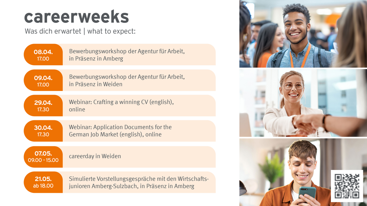 Fachkräftemangel, New Work, Bewerbungen über Social Media... die Arbeitswelt verändert sich und mit ihr auch die Bewerbungsprozesse. Doch was zeichnet eine erfolgreiche Bewerbung aus? Um diese und viele weitere wichtige Fragen geht es in unseren Workshops und Vorträgen im Rahmen der careerweeks. Holt Euch von erfahrenen Personaler*innen und Berufsberater*innen wertvolle Tipps für einen erfolgreichen Karrierestart oder übt mit Unternehmensvertreter*innen Vorstellungsgespräche und Selbstpräsentation. Anmeldung und Programm findet Ihr online.