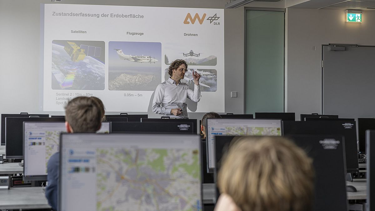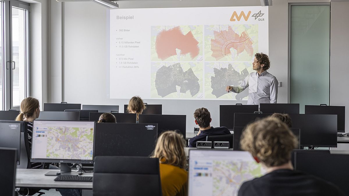 Es folgte eine zweiteilige, interaktive Vorlesung von Professor Meißner zur spontanen Generierung von Luftbildkarten mithilfe von Drohneneinsätzen. Parallel dazu konnten die Schülerinnen und Schüler eine virtuelle Befliegung eines 3D-Modells der Stadt Amberg erleben, das vollständig aus Luftbilddaten erstellt wurde.