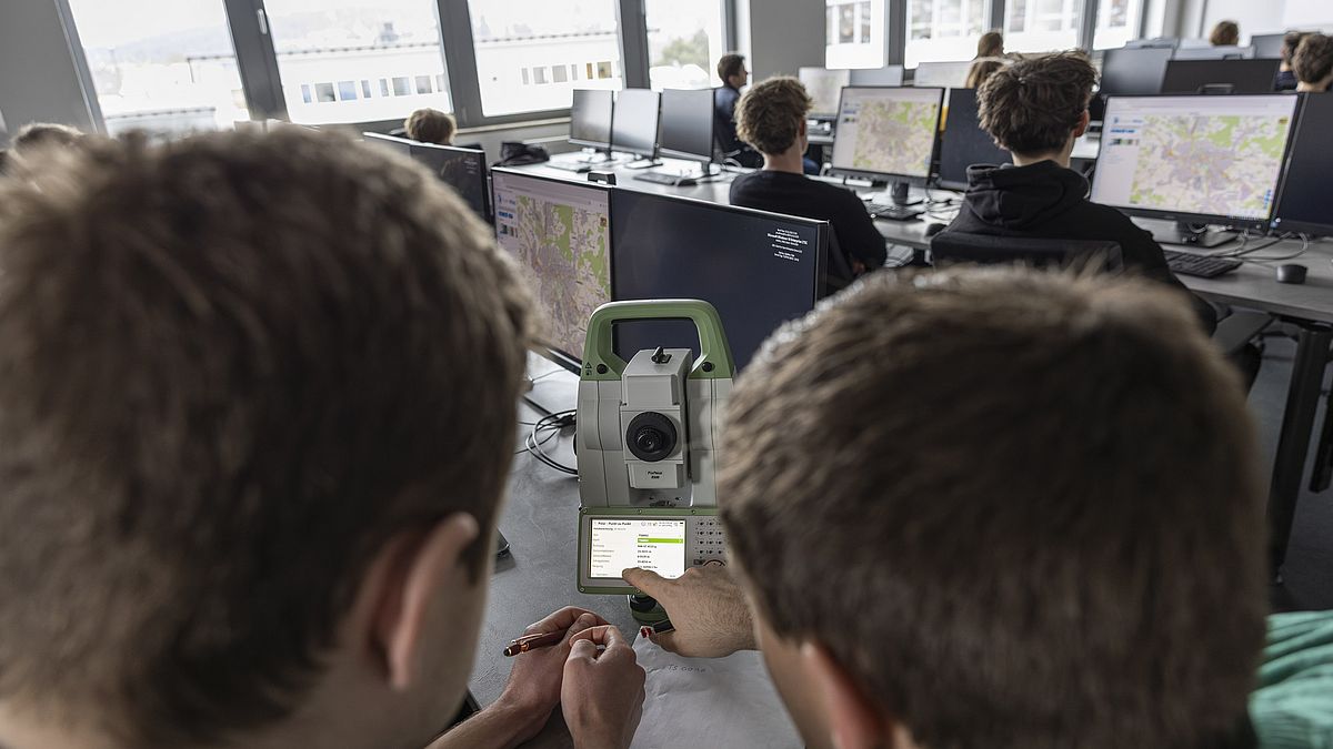 Nach einer kurzen Vorstellung des Studiengangs und seiner Besonderheiten ging es direkt in die praktische Arbeit: Mithilfe von Tachymetern wurde das Klassenzimmer möglichst präzise vermessen. Anschließend wurde auf Basis trigonometrischer Verfahren und Vektorberechnungen das Raumvolumen ermittelt. Ergänzt wurde das Programm durch eine Einführung in die Drohnentechnik sowie einen Grundlagenvortrag zur Künstlichen Intelligenz am Beispiel der optischen Zahlenerkennung.