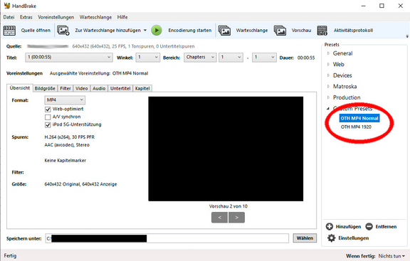 Mit „Quelle öffnen“ wählt man die Videodatei aus. Anschließend eines der beiden Presets anwählen. Vorzugsweise ist hier das Preset „OTH MP4 Normal“ zu verwenden. Dies skaliert das Video auf eine Auflösung von 640 Pixel Breite herunter, wodurch die Datei viel kleiner wird. Falls dadurch erforderlicher Text nicht mehr richtig zu lesen ist, kann man auch das andere Preset verwenden, welches die FullHD-Auflösung des Videos beibehält.