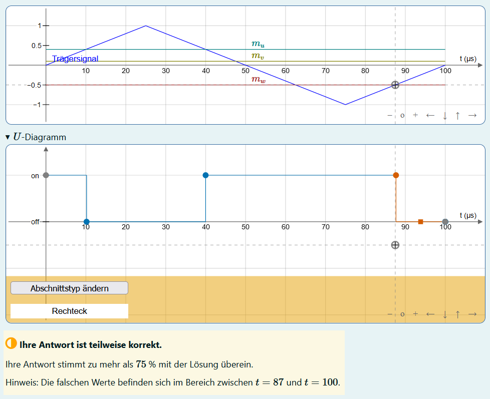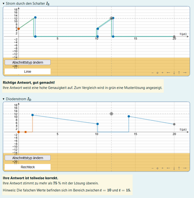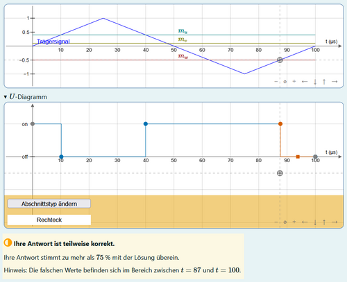 Das Besondere an der Aufgabe ist, dass sie neben der Eingabe von einfachen Berechnungsergebnissen auch ein komplexeres Zeichentool zur graphischen Eingabe von Schaltverläufen enthält. Die Studierenden können dabei Schalt- sowie Spannungsverläufe aus mehreren Abschnitten aufbauen und ihre Antwort überprüfen lassen. Dabei wird Feedback über die Ähnlichkeit zur Lösung gegeben. Durch die verwendete Randomisierung kann die Aufgabe mehrmals mit neuen Werten wiederholt werden.