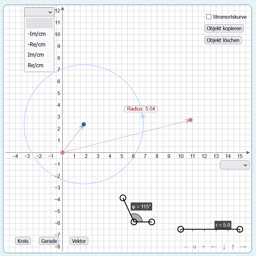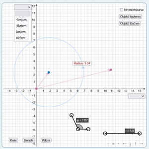 In einem iterativen Prozess entstand nach den Anforderungen und regelmäßigem Feedback des Dozenten ein wiederverwendbares Zeichentool zur Konstruktion von Stromortskurven. Mit Hilfe einer dynamischen Koordinatenanzeige und der Platzierung einfacher geometrischer Objekte kann dabei u.a. die Mittelsenkrechte graphisch ermittelt werden. Zusätzliche Hilfswerkzeuge zum Messen von Winkeln und Längen erlauben u.a. das Ablesen bestimmter Betriebspunkte.