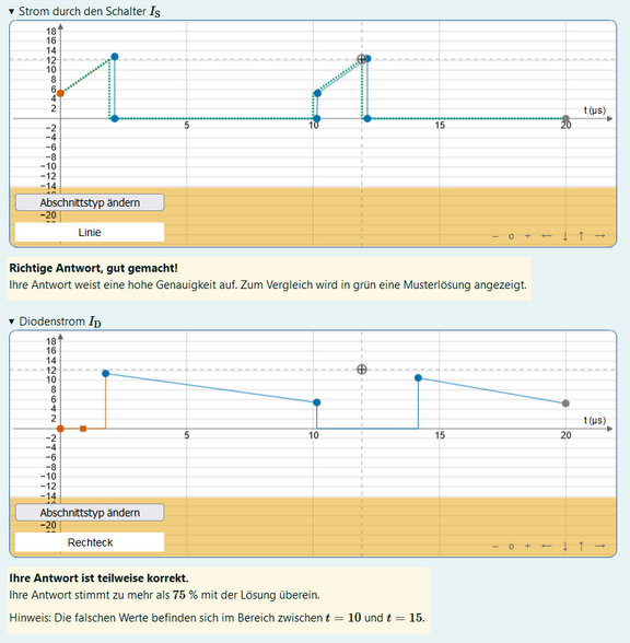 Das Besondere an der Aufgabe ist, dass sie neben der Eingabe von einfachen Berechnungsergebnissen auch ein komplexeres Zeichentool zur graphischen Eingabe von Schaltverläufen enthält. Die Studierenden können dabei Schalt- sowie Spannungsverläufe aus mehreren Abschnitten aufbauen und ihre Antwort überprüfen lassen. Dabei wird Feedback über die Ähnlichkeit zur Lösung gegeben. Durch die verwendete Randomisierung kann die Aufgabe mehrmals mit neuen Werten wiederholt werden.