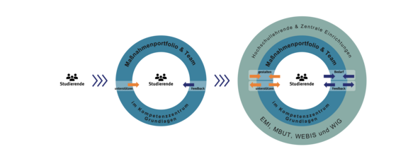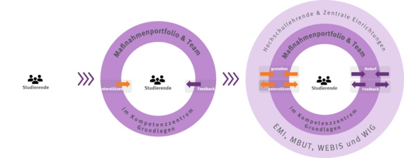 Das Kompetenzzentrum Grundlagen verfolgt einen hochschulweiten und studierendenzentrierten Ansatz. Mit Hilfe von passgenauen Empfehlungen werden Studierende gemäß ihren individuellen Voraussetzungen und Kompetenzen gefördert. Lehrende können auf erprobte Lernressourcen zurückgreifen, die die unterschiedlichen Bedürfnisse bzw. Vorkenntnisse der Studierenden berücksichtigen. Als zentrale Zielgruppen profitieren Studierende und Lehrende vom Maßnahmenportfolio und sind an dessen Entwicklung aktiv beteiligt.