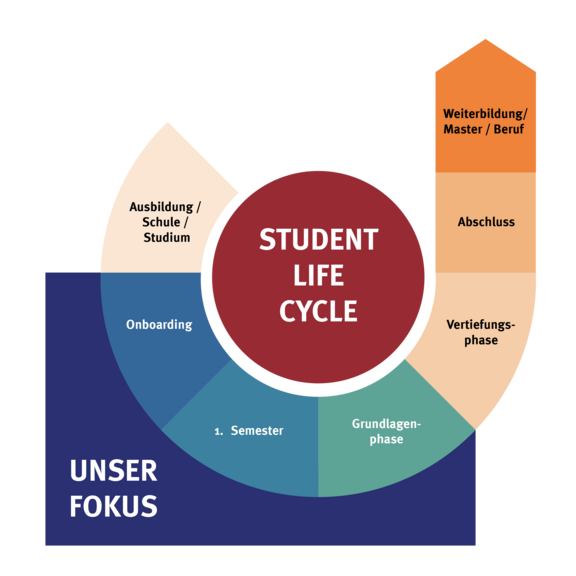 Wir erfassen, generieren und entwickeln unterstützende Maßnahmen harmonisch im hochschulweiten Maßnahmenportfolio und setzen diese in Zusammenarbeit mit weiteren zentralen Einrichtungen um. Im Student Life Cycle adressieren wir hochschulweit vorrangig den Übergang von Schule und/oder Beruf zur Hochschule und daran anknüpfend die Studieneingangsphase (typischerweise 1.-3. Fachsemester) aus fachlicher Sicht. Dadurch fördern wir als Hochschule Studierende gemäß ihrer individuellen Voraussetzungen und Kompetenzen. Unsere operativen Schwerpunkte gliedern sich momentan in drei Arbeitsfelder: