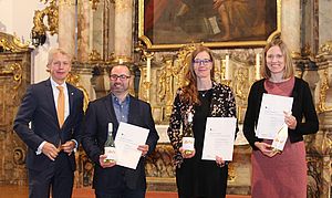 Im Rahmen der Akademischen Feier am 29.11.2023 erhielten Prof. Dr. Ulf Kreuziger, Prof. Dr. Lisa Marie Ranisch und Prof. Dr. Mandy Hommel das Zertifikat Hochschullehre Bayern von Prof. Dr. Clemens Bulitta (Präsident der OTH Amberg-Weiden).