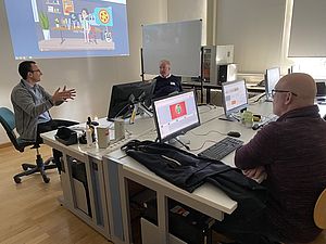 Am 16.10.2023, 9:00 Uhr bis 18:0 Uhr, fand der Workshop „Zeichentrick in der Hochschullehre” mit Prof. Dr. Ingo Striepling (OTH Regensburg) in Amberg statt. Anhand vieler eigener, anschaulicher Beispiele wurden die Teilnehmerinnen und Teilnehmer in die Arbeit mit Vyond eingeführt. Am Ende des Tages konnte jede und jeder einen ersten Entwurf präsentieren. Ein gelungener Auftakt für die Arbeit mit Zeichentrick und deren Integration in aktivierende Hochschullehre!