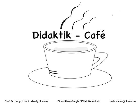 Mit dem Didaktik-Café biete ich die Möglichkeit zum informellen und zwanglosen Austausch über hochschuldidaktische Themen, Ideen und Anliegen bei einem Kaffee/Tee und/oder einem gemeinsamen Mittagessen. Im Wintersemester 2025/2026 lade ich zum Didaktik-Café am 21.10.2025 in Weiden (Orange Lounge Mensagebäude) und am 4.11.2025 in Amberg (EMI 107) ein, jeweils von 13:00 Uhr bis 14:00 Uhr. Ich freue mich auf Eure/Ihre Fragen und den Austausch!
