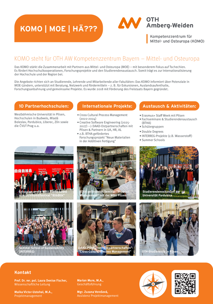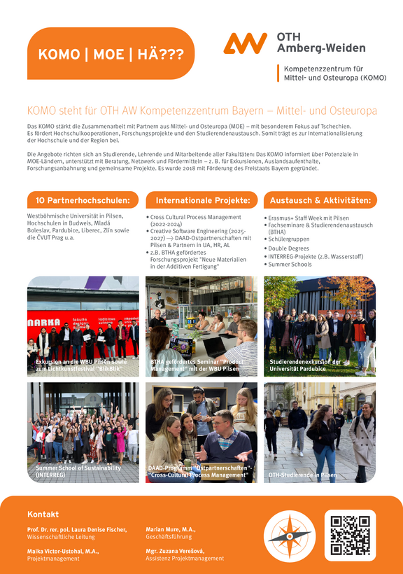 - KOMO – Kompetenční centrum Bavorsko – střední a východní Evropa podporuje výměny, spolupráci a projekty s českými partnery a nabízí poradenství – a to i v češtině. Geografická blízkost a dlouhodobá hospodářská spolupráce mezi východním Bavorskem a Českem usnadňují vstup do studia i do regionálního pracovního trhu.