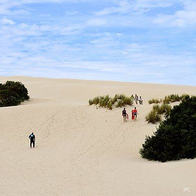 Während der letzten gemeinsamen Tage planten die Studierenden in Zusammenarbeit mit ihrem Prof. Dr.-Ing. Magnus Jaeger einen Ausflug nach Kangaroo Island, der drittgrößten Insel Australiens ungefähr 110 Kilometer südwestlich von Adelaide im Gulf Saint Vincent im Bundesstaat Südaustralien. Zu einem der ersten Ziele zählte Little Sahara, welche - wie der Name bereits sagt - aus eindrucksvollen Dünen aus weißem Sand besteht. Es ist die größte Ansammlung von Dünen nahe der Südküste. Zwischen Seal Bay und Vivonne Bay gelegen, erstreckt sie sich mit einer Länge von über 15 Kilometern. Die spektakuläre Aussicht vom Gipfel auf die Dünen und die Vegetation sind die Mühen des Aufstieges definitiv wert.
