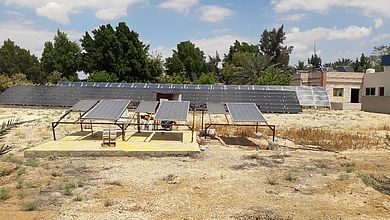 Fangen wir mit dem eigentlich Wichtigsten an, dem eigentlichen Grund für mein Auslandssemester, der Bachelorarbeit: Tief unten im Jordangraben, 350 m unter dem Meeresspiegel, inmitten von Bananen- und Dattelplantagen stehen mehrere Photovoltaikanlagen. Eine davon betreibt eine Pumpe samt Wasserentsalzungsanlage (Umkehrosmose), welche das geförderte salzige Grundwasser auf Trinkqualität bringt. Das dortige Grundwasser, nur wenige Kilometer von einem der salzigsten Gewässer der Erde – dem Toten Meer – entfernt, wird nach der Aufbereitung zur Bewässerung der umliegenden Farmen benutzt. Momentan läuft parallel dazu noch eine kleine Testanlage, wo die Auswirkung eines simplen Kühlsystems auf die Performance eines PV-Moduls untersucht wird. Mit diesen Testergebnissen sowie den Messergebnissen eines vergangenen Testaufbaus und einer Simulation möchte ich ein Scale-Up für ein Kühlsystem für die große PV-Anlage berechnen, die die Entsalzungseinheit betreibt.