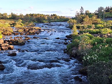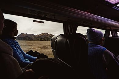 One thing that particularly surprised me was the sheep. When we finally left the ring road - or Route 1 - and turned left into the Highland, we drove past several herds of horses and sheep. Hay bales adorned the summer landscape of green fields and meadows. In the background, white glaciers stood out in colour against the otherwise blue mountains, and a few clouds adorned the landscape. At one point, the tour guide pointed out that we were now passing Hekla, one of the most famous and active volcanoes in Iceland. It is also one of the least predictable volcanoes in Iceland and often erupts without much warning. Then the landscape began to change and we were looking at a black desert as we turned onto an unpaved gravel road. But even here we kept coming across a few sheep out to graze in summer, where no human soul lived for miles around. In the course of September, they will be chased down to the valley and their farms at the so- called Rettír for the duration of winter. It was an unreal landscape, almost like being on another planet, and only the sporadic traffic on the road showed that humans were even exploring this corner of the world.