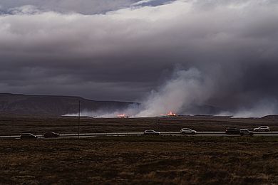 It was August 22nd when Sundhnúkur erupted once again. For me, who of course wasn't used to something like this, it was super exciting.Together with a number of other Erasmus students, we set off the next day in the evening straight after work on the public bus. When we got off at the bus stop, the wind was whistling across the peninsula. A few meters up the hill, we finally had a view of the eruption, opposite the highway. We braced ourselves against the wind and somehow couldn't quite believe that we were actually looking at a volcanic eruption. I can't remember how long we stood there, it was somehow just too surreal to take our eyes off it.