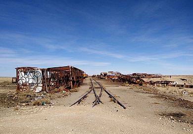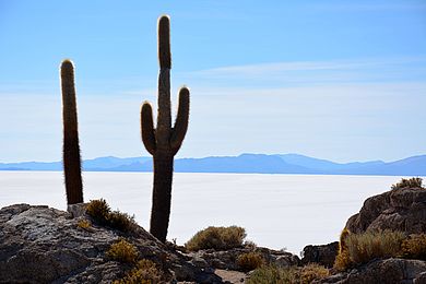 Als Nächstes sollte es nach Uyuni gehen, um den Salar de Uyuni, den mit mehr als 10000 Quadratkilometern größten Salzsee der Welt, zu besichtigen. Außerhalb der Trockenzeit von Ende Juni bis Anfang Dezember ist der Salzsee trocken und kann von Sprintern und Bussen befahren werden. Auf dem Salzsee gibt es sogar Inseln, wir haben im Rahmen unserer Tour die Isla del Pescado angeschaut. Außerdem gibt es in Uyuni den Zugfriedhof Cementerio de los Trenes, auf dem man alte und verrostete Lokomotiven und Waggons bestaunen kann.
