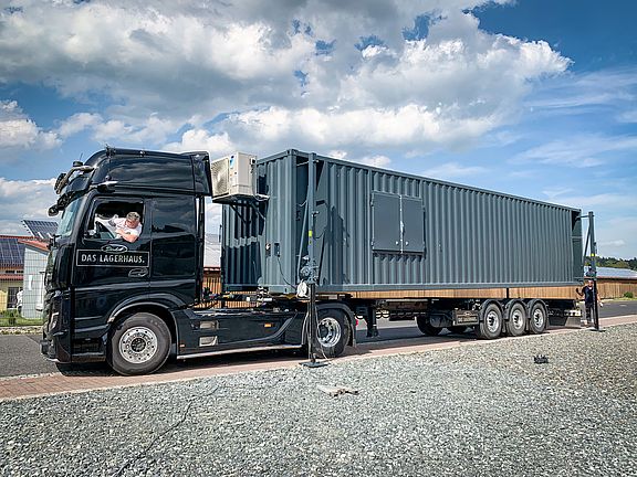 Das mobile Labor wird mit Hilfe einer Spedition durch ganz Ostbayern transportiert. Für das Ab- bzw. Aufsetzen des Containers auf einen Sattelauflieger ist das mobile machbar Innovationslabor mit vier vollautomatisierten Elektrostützen der Firma Haacon Hebetechnik ausgerüstet.