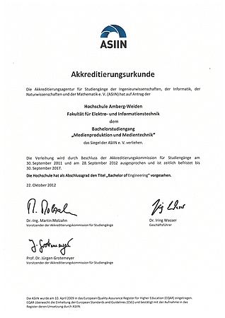 Beitrag lesen ›Der Bachelor-Studiengang „Medienproduktion und Medientechnik“ und der Master-Studiengang „Medientechnik und Medienproduktion“ (Fakultät Elektro- und Informationstechnik) haben das Siegel der Akkreditierungsagentur ASIIN e. V. erhalten. Die Verleihung wurde durch Beschluss der Akkreditierungskommission bis zum 30. September 2017 ausgesprochen.