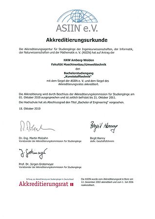 Beitrag lesen ›In der Fakultät Maschinenbau/Umwelttechnik haben die Studiengänge Umwelttechnik, Erneuerbare Energien, Maschinenbau, Patentingenieurwesen, Kunststofftechnik, Environmental Engineering sowie Innovation Focused Engineering and Management das Akkreditierungsverfahren erfolgreich durchlaufen. Die Akkreditierung ist durch die ausgewählte Agentur für Studiengänge der Ingenieurwissenschaften, der Informatik, der Naturwissenschaften und der Mathematik e. V. (ASIIN) mit Schreiben vom 18. Oktober 2010 ausgesprochen worden.