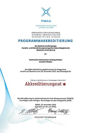 Beitrag lesen ›In der Fakultät Betriebswirtschaft hat der Studiengang Handels- und Dienstleistungsmanagement (Bachelor of Arts) das Akkreditierungsverfahren mit der Auflagenerfüllung erfolgreich durchlaufen. Die Akkreditierung erfolgte durch die Agentur FIBAA mit Beschluss der Akkreditierungskommission für Programme vom 19. Juni 2015. Damit ist der Bachelor-Studiengang ohne weitere Auflage bis Ende des Wintersemesters 2018/2019 akkreditiert.