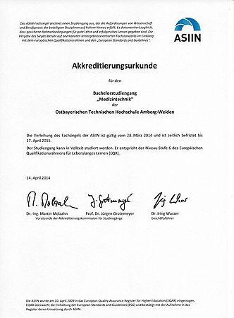 Beitrag lesen ›Mit dem erfolgreichen Verfahren für die Studiengänge Medizintechnik und Angewandte Informatik sind die Akkreditierungen der 18 Studiengänge der Ostbayerischen Technischen Hochschule Amberg-Weiden erfolgreich abgeschlossen. Damit wurde das gesamte Studienangebot der OTH Amberg-Weiden von externen Akkreditierungsagenturen positiv bewertet und mit den entsprechenden Qualitätskennzeichen und Urkunden versehen.