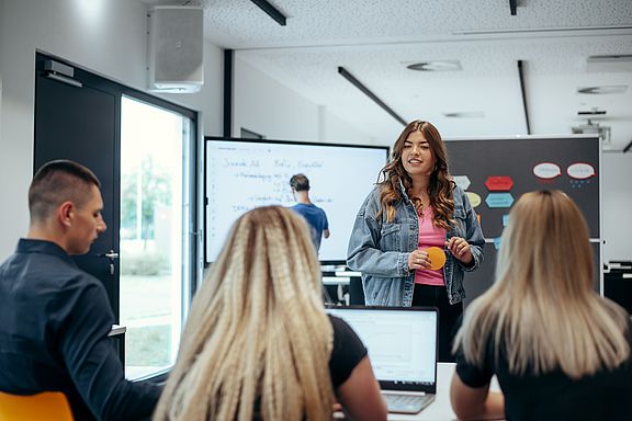 Ob du dich lieber breit aufstellst oder spezialisierst, entscheidest du selbst: Im Wahlbereich gestaltest du dein Kompetenzprofil – etwa mit Fokus auf KI-Management, E-Commerce Management, Smarte Logistik oder Digital Business Consulting. Wer einen dieser Schwerpunkte gezielt verfolgt, bekommt zusätzlich zur Bachelor-Urkunde ein Zertifikat über das gewählte Kompetenzprofil. Gelernt wird in kleinen Gruppen, mit moderner Technik, direkter Betreuung und echten Herausforderungen aus der Praxis – hands-on, vernetzt und zukunftsorientiert.