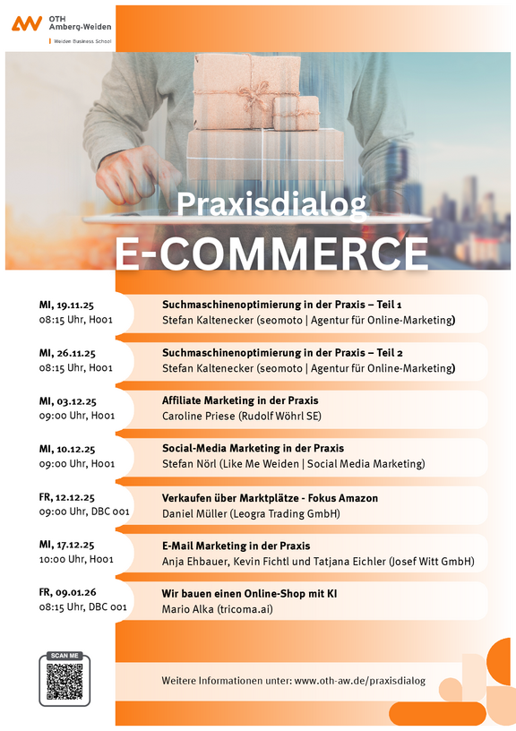 An der Weiden Business School berichten zahlreiche E-Commerce-ExpertInnen von November 2025 bis Januar 2026 in insgesamt sieben Vorträgen aus der Unternehmens-Praxis. Dieser „Praxisdialog E-Commerce“ greift dabei Themen rund um Online-Marketing, Online-Shops und Online-Marktplätze auf. Wir freuen uns auf interessante Vorträge und Diskussionen.