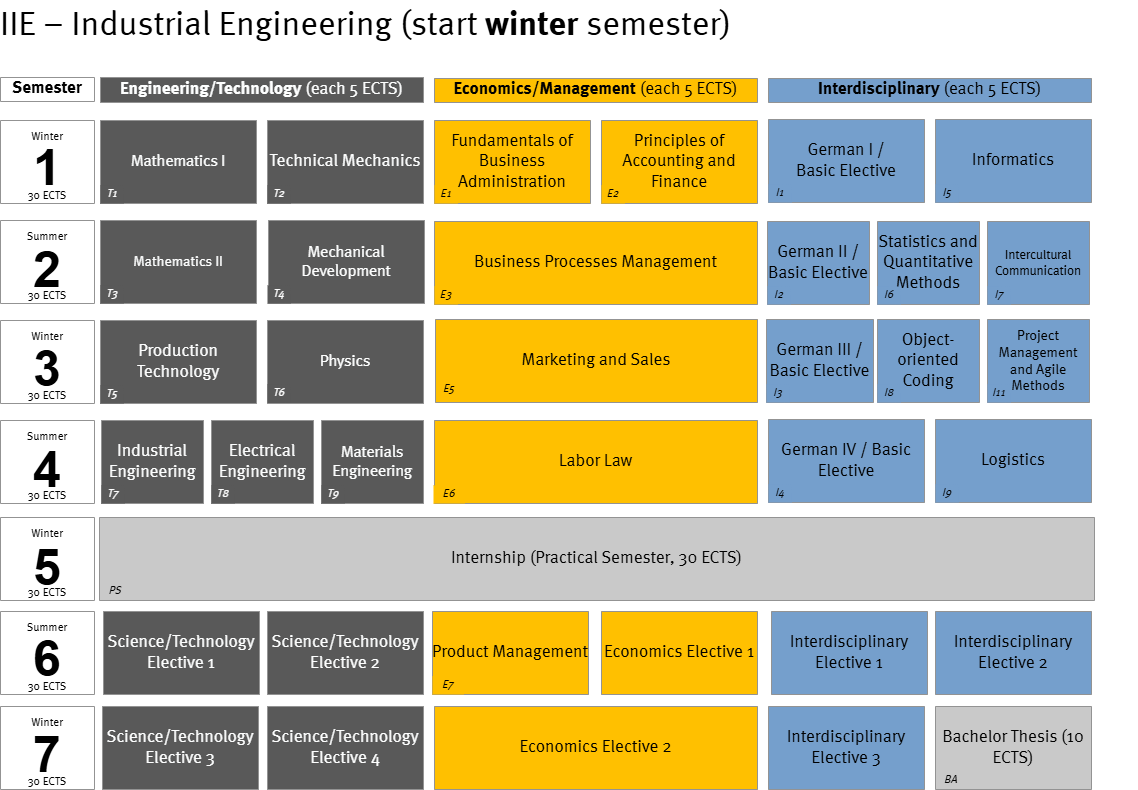 Im technischen Teil des Studiengangs lernen Sie sowohl Grundlagen wie Mathematik oder CAD, als auch weiterführende Themen wie Data Science, Automatisierung oder Robotik. Der Managementteil konzentriert sich auf betriebswirtschaftliche Kenntnisse im industriellen Bereich, wie Business Process Management oder Marketing und Vertrieb. Interdisziplinär erwerben Sie einerseits sprachliche Kompetenzen, beschäftigen sich jedoch auch mit übergreifenden Disziplinen wie Logistik oder Softwareentwicklung.