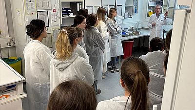 Dort konnten sie modernste medizinische Diagnostik unter die Lupe nehmen. Schon bei der Probenannahme und -verteilung wurde den Teilnehmenden bewusst, welche logistischen und technischen Anforderungen an ein modernes Labor gestellt werden. In den Fachabteilungen der mikrobiologischen und molekularbiologischen Diagnostik erhielten die Studierenden dann detaillierte Einblicke in die Probenvorbereitung und -verarbeitung.