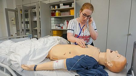 Deshalb simuliert die OSCE-Prüfung authentische Situationen, wie sie den Studierenden später im Praxisalltag zum Beispiel in der Inneren Medizin, der Notfallmedizin oder der Chirurgie begegnen können: Sie müssen etwa in einem Anamnesegespräch Informationen für einen Anfangsverdacht sammeln, Untersuchungen am Menschen und an einer Simulationspuppe durchführen und auswerten, Labor- und EKG-Ergebnisse interpretieren und chirurgische Nähte korrekt ausführen.