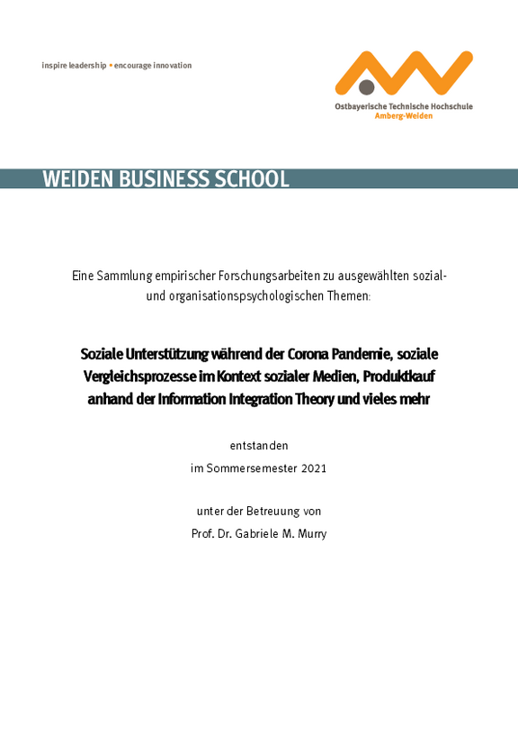 Im Februar 2022 wurde eine Sammlung empirischer Forschungsarbeiten zu ausgewählten sozial- und organisationspsychologischen Themen veröffentlicht. Studierenden aus dem Master Angewandte Wirtschaftspsychologie hatten diese Forschungsinhalte unter der Betreuung von Prof. Dr. Gabriele M. Murry im Rahmen des Kurses „Organisations- und Sozialpsychologie“ im Sommersemester 2021 erarbeitet.