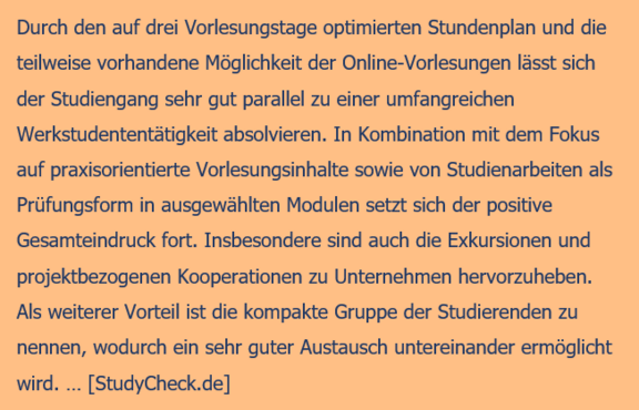 Des Weiteren bieten wir Ihnen im Rahmen von Exkursionen die Gelegenheit, einen Blick hinter die Kulissen renommierter Unternehmen zu werfen. Sie erhalten hierbei interessante und spannende Einblicke in die Strukturen und Prozesse verschiedenster Unternehmensbereiche. Darüber hinaus holen wir regelmäßig Expert*innen aus Wirtschaft und Industrie für Gastvorträge an die Hochschule, um Sie über aktuelle Themen und Trends aus erster Hand zu informieren.
