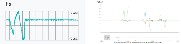 Die folgenden zwei Grafiken zeigen Beispiele für mögliche Datenvisualisierungen in der Web-Oberfläche. Die linke Grafik stellt live die Kräfte der x-Achse dar, während in der rechten Grafik die historischen Daten verschiedener Kräfte des Roboters visualisiert werden. Darüber hinaus wurden verschiedene Analysemethoden implementiert, um z.B. Minima und Maxima zu ermitteln.
